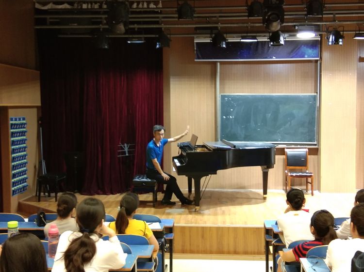 8月9日,为提高“省培”学员合唱指挥能力,太阳集团tyc234cc副院长陈新宇教授在艺术楼八音讲堂为“省培”学员讲授合唱指挥课。