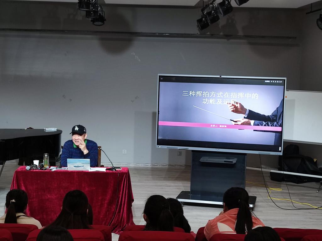 2021年10月25日,陈家海教授受邀来到太阳集团tyc234cc,在艺术楼八音讲堂为2021年河南省骨干教师培训项目小学音乐培训班学员讲授《三种挥拍方式在指挥中的功能及作用》,院长陈新宇主持。