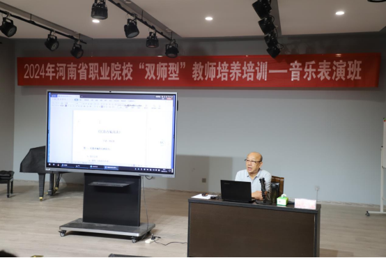 2024年7月14日上午,应我院之邀,国家一级作曲家刘宏奎老师为2024河南省“双师型”教师培养培训音乐表演班学员讲授《大别山民歌改编》这一专题,并分享了自我的研究成果与学员们进行积极的探讨。