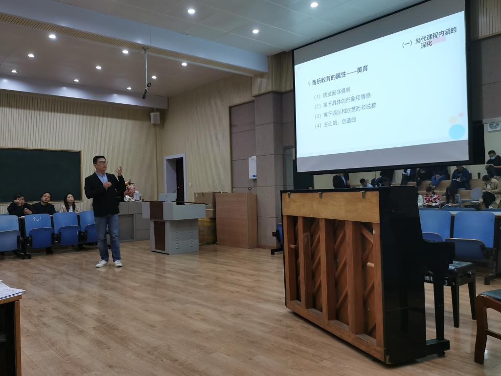 课上,李嘉栋从音乐教师要教给学生什么?学生学什么?等问题出发,以音乐教育的属性、折中主义教育哲学、课程视角的转换、三个系统交集中架构等方面,深度探讨了新旧两种课程标准的精准差异;从用不同课程观的借鉴、核心素养的内涵等方面着重分析了音乐教学的价值取向;从音乐教学的原则、提升审美品质、音乐教学设计框架、理解音乐教材、音乐教学设计的思维逻辑等五个方面诠释了音乐课堂如何进行教学设计;从音乐教学的核心要素、基本框架、教学结构、音乐教学设计的思维逻辑等方面详细的诠释了音乐教学如何设计框架。期间,李嘉栋老师还结合了具体的课堂设计案例进行了示范教学,整场报告既有理论高度又有实际操作,让全体音乐教师对音乐教学有了更深的认识,更新了教学理念,受益匪浅。