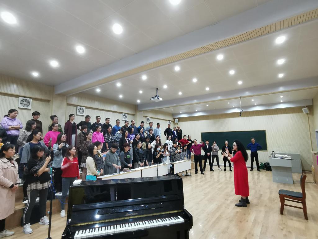 讲座中,苏严惠教授首先从合唱的声音概念、训练方法和合唱指挥技巧等问题出发,以儿童嗓音的特点、童声训练技巧为侧重点,用风趣幽默的语言向学员们系统讲解了童声训练过程中需要注意的问题、如何组建童声合唱团及其基本的和声训练方法。下午,苏教授结合我院“停云”合唱团的合唱表演进行现场实践教学。合唱团在李彩彩老师的指挥下,演唱了《八骏赞》、《jubilate Deo》等曲目,苏严惠教授聆听了演唱后,对合唱团的表现给予充分肯定,对学生的良好发声情况和演唱状态给予了认同和表扬,她结合合唱团的表演对合唱作品声音、情感的处理进行了进一步的的指导。本次的排练讲座使大家见识到了真正的大师风范,也充分认识到作为一名合格的指挥所应具备的专业素质。苏老师还在互动环节对部分老师所提出的高音的训练、指挥的预示等问题一一做了详尽的解答和示范排练。苏教授细致详细的讲解和清晰明确的指挥提示让在座学员受益匪浅。