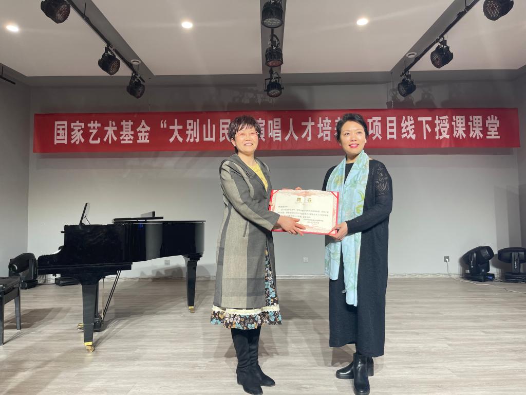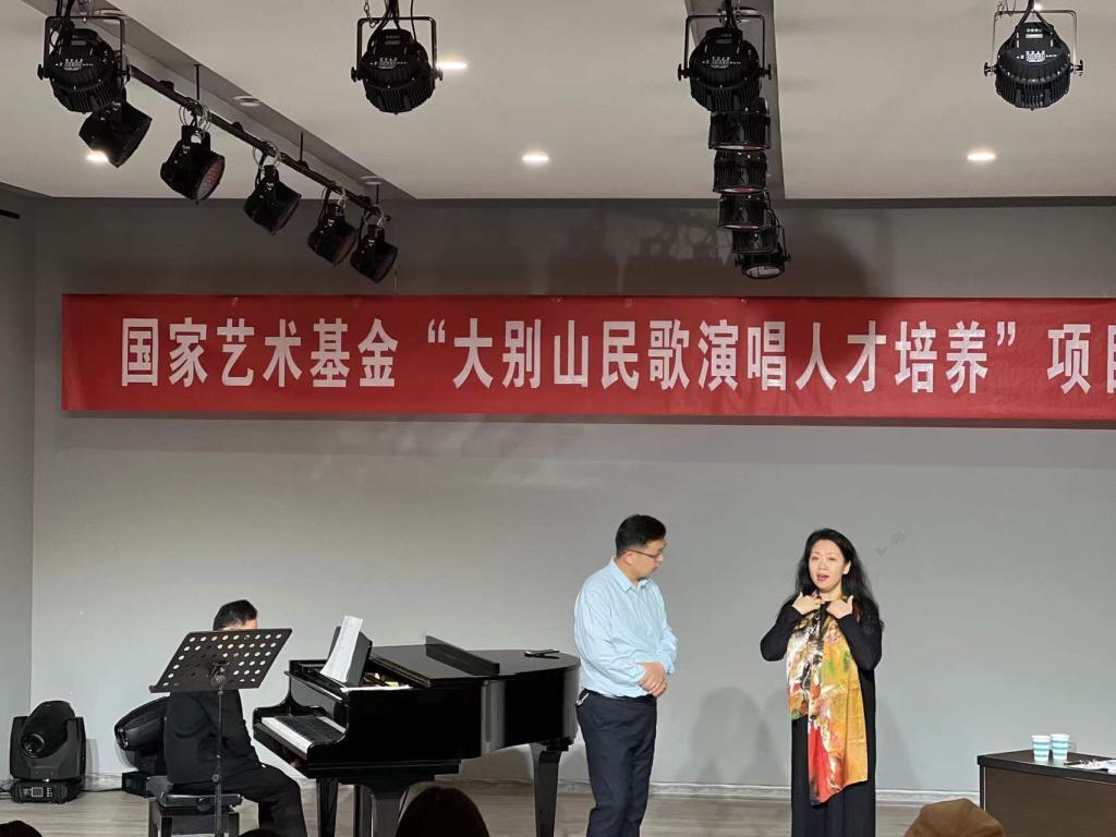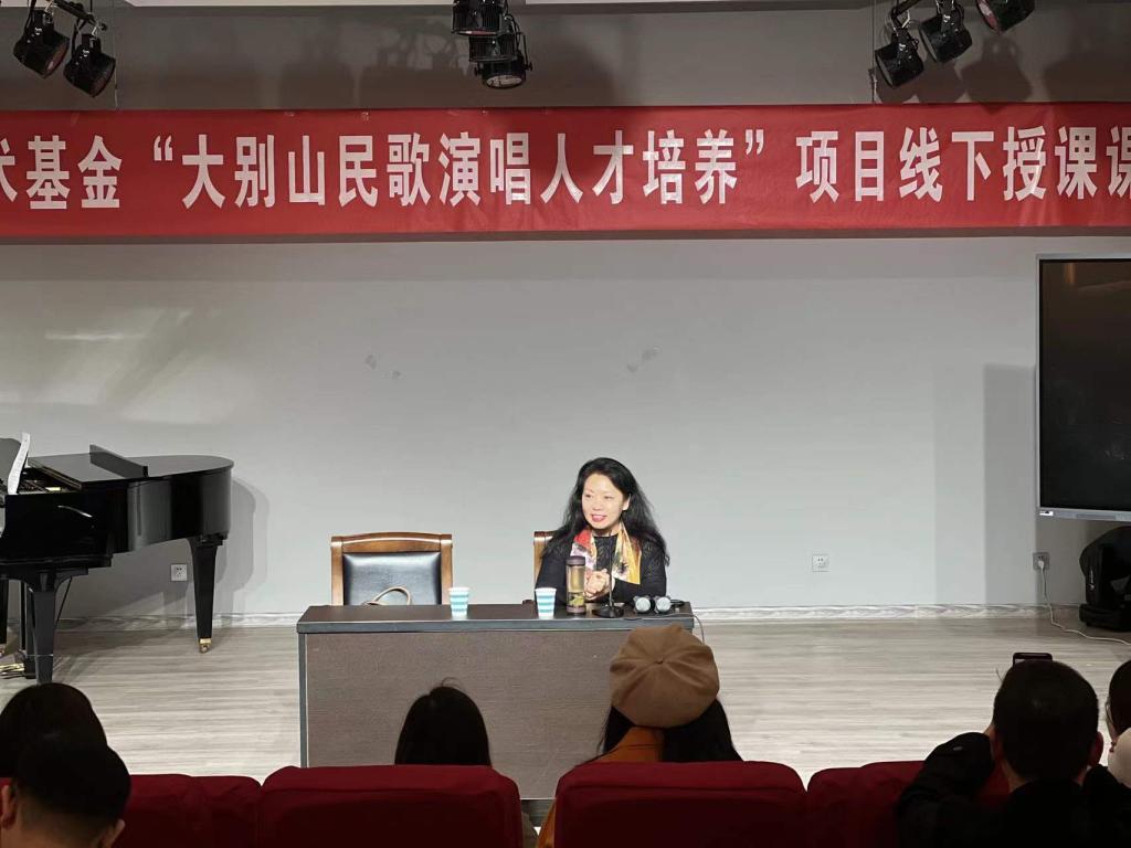 3月11日上午,河南大学音乐学院声歌系主任黄慧慧教授受我院邀请为“大别山民歌演唱人才培养”项目学员授课,课程在太阳集团tyc234cc一楼八音讲堂进行。
