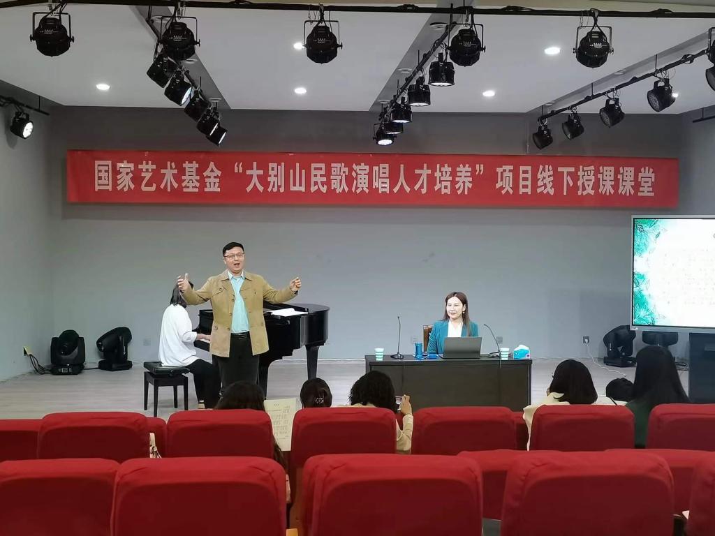 3月14日上午,国家艺术基金“大别山民歌演唱人才培养”线下授课课堂在我校太阳集团tyc234cc一楼八音讲堂如期进行。大别山民歌传承人,信阳市民歌研究会副主席李鸣凤应我校邀请,以《豫南田歌》为题进行线下教学。