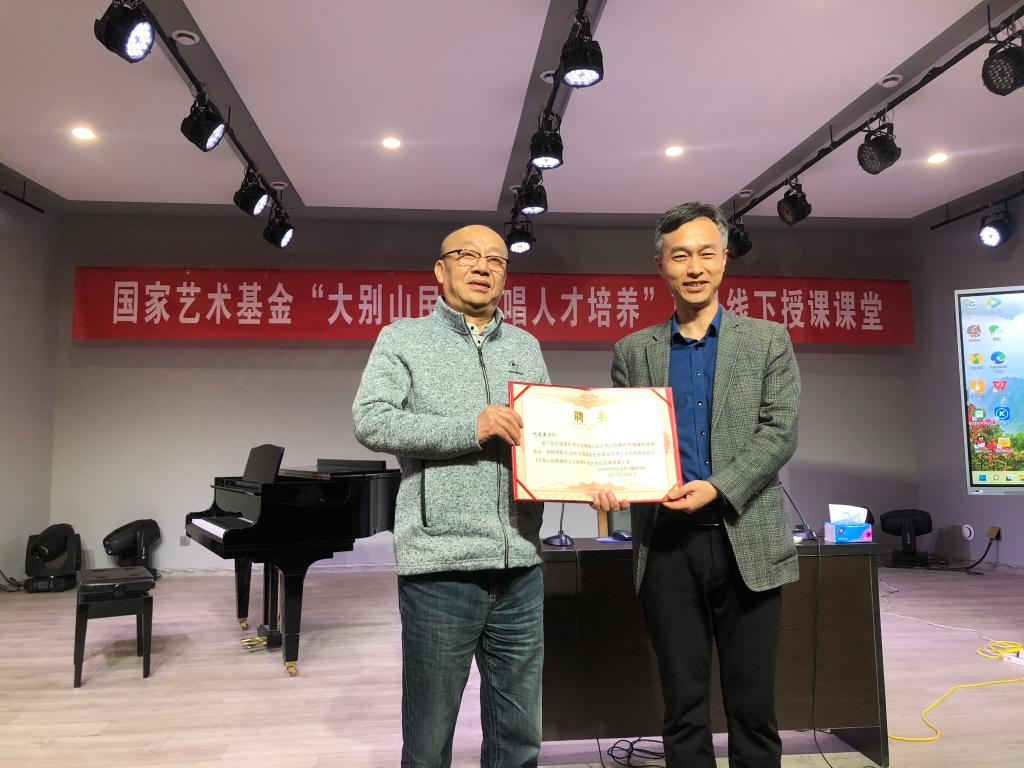 首先由太阳集团tyc234cc陈新宇院长给刘宏奎主席颁发2020年度国家艺术基金艺术人才培养资助项目《大别山民歌演唱人才培养》的艺术总监兼授课专家的聘书。接下来刘主席讲到国家艺术基金要求通过这个项目不仅传承大别山民歌,而且应该把大别山民歌推陈出新,推向全国。因此希望各位学员重视来之不易的学习机会。然后学员王亚辉、孙寒利、刘凤、郭楠楠、林欢欢、陈娟、鲁勇等逐一上台演唱大别山民歌《五月红杜鹃》《梅花吟》《一起改变》《叫一声我的哥》《歌从信阳来》《喊醉了太阳喊红了天》等,刘宏奎主席对每个学员的演唱仔细聆听,逐一给他们讲解每首歌曲的情感,对每个老师的演唱进行了细致入微的指导。本次的课对学员后期大别山民歌的演唱起到了重要的指导作用。