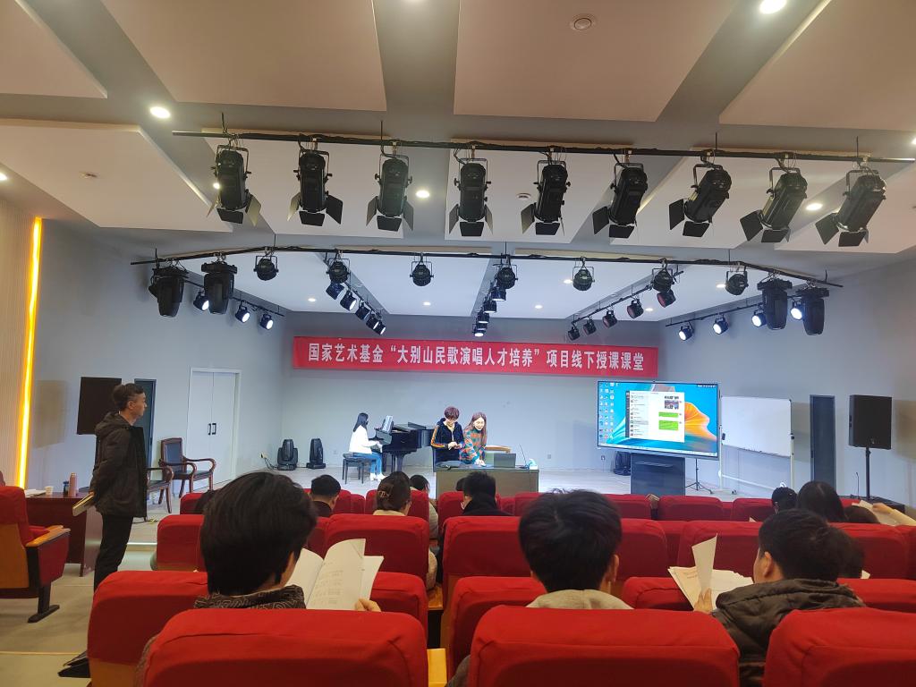 3月18日下午,国家艺术基金“大别山民歌演唱人才培养”线下授课课堂在我校太阳集团tyc234cc一楼八音讲堂如期进行。大别山民歌传承人,信阳市民歌研究会副主席李鸣凤老师应我校邀请,为学员授课,参与实践课的还有韩冰副教授和张梦晗老师。