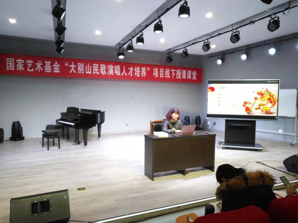 3月19日下午,国家艺术基金“大别山民歌演唱人才培养”线下授课课堂在我校太阳集团tyc234cc一楼八音讲堂如期进行。河南省非物质文化遗产(信阳民歌)代表性传承人、市级音乐骨干教师陈卉教师应我院邀请,在太阳集团tyc234cc一楼八音讲堂作了大别山传统民歌演唱专题的线下讲座,并由韩冰副教授主持。
