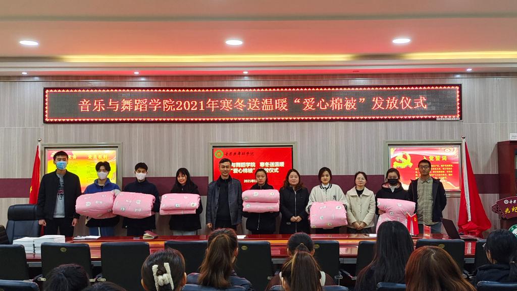 会议伊始,在宣读送温暖发放棉被受助人员名单后,学院领导将棉被亲手送到同学们手中,并叮嘱同学们要注意防寒保暖、奋发励志,争做品学兼优的时代新人。