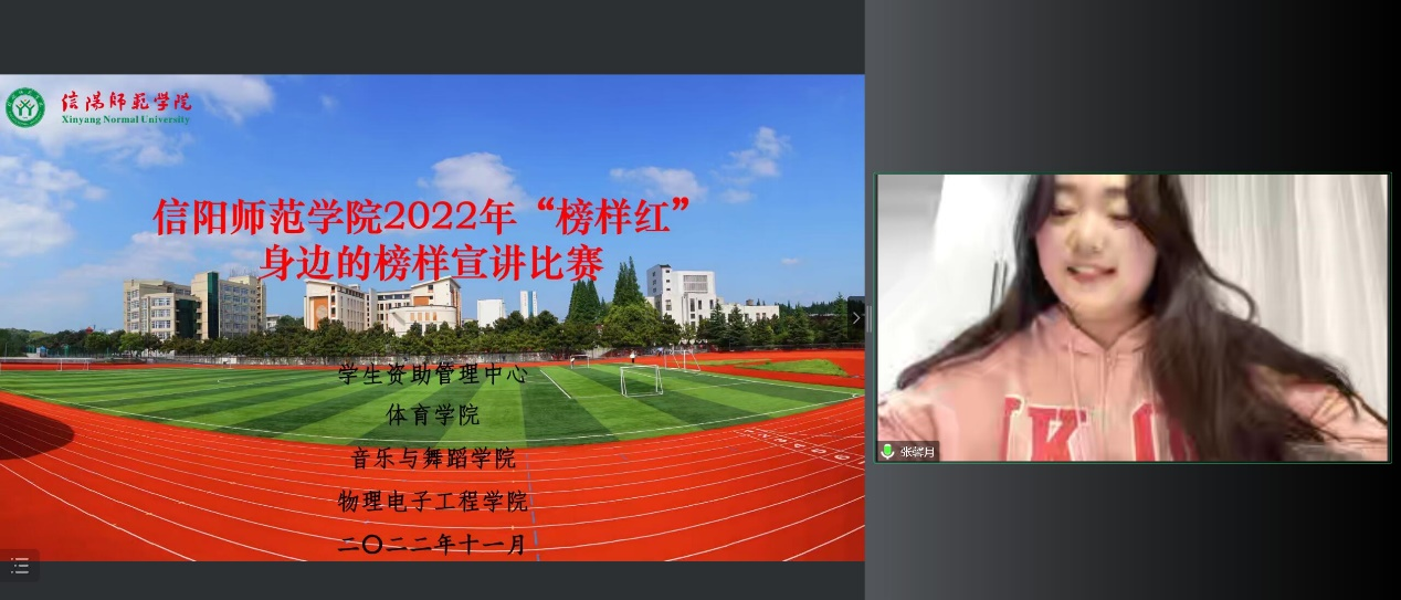 为落实国家资助政策,充分发挥身边青年榜样的先进导向作用,进一步加大学生资助宣传力度,加强学生资助育人功能。2022年12月1日由学生处资助中心统一规划,太阳集团tyc234cc、体育学院与物理电子工程学院共同筹办的“榜样红·身边的榜样”宣讲活动通过线上会议顺利举行。由国家奖学金获奖人传媒学院杨乔丹、太阳集团tyc234cc自强之星数学与统计学院曾一凤、太阳集团tyc234cc校园明星外国语学院田润丰3位宣讲人以及我院200余名学生代表共同参与此次活动。活动由张馨月主持。