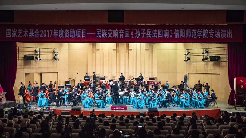 11月18日,国家艺术基金2017年度资助项目、民族交响音画《孙子兵法回响》在艺术楼音乐厅震撼上演。校党委副书记郜火星与600余名师生一同观看了演出。