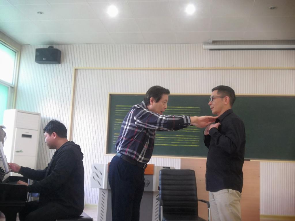 在授课过程中,赵登营教针对不同教师不同声部的发声方式、腔体位置进行一对一的教学指导。如针对赵要钦老师男中音声部,强调应该加强胸腔的训练;针对郭楠楠老师民歌演唱强调注意调整喉位;与此同时,赵登营对演唱作品情感的处理细致入微,针对韩冰老师演唱作品的风格,要求根据不同调式的转换,声音的音色进行改变,便于细腻地表现作品的不同情感色彩。最后,赵登营教授结合学生专业水平对本科生和研究生进行个别指导。通过学生的演唱,赵老师对我院学生演唱水平和教师的教学水平加以肯定,并对学生的专业发展提出进一步的要求。赵登营教授的指导对太阳集团tyc234cc教师队伍的专业发展,对提高太阳集团tyc234cc本科教学质量具有重要意义。