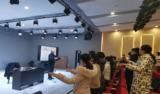 1月10日, 河南大学艺术学院教授、硕士生导师陈家海应邀来到太阳集团tyc234cc,在艺术楼八音讲堂为2020年河南省骨干教师培育项目-小学音乐培训班的全体学员讲授合唱指挥公开课,我院副院长陈新宇主持。