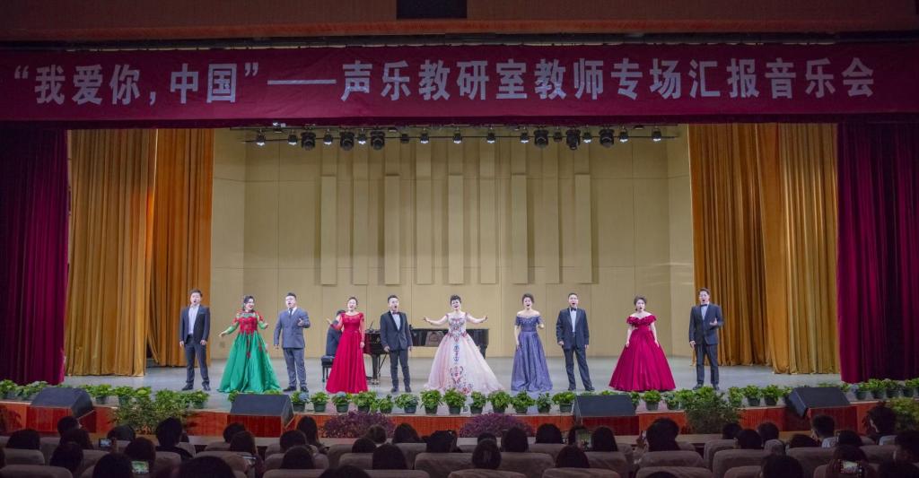 音乐会以“我爱你,中国”为主题,由青年教师罗一鸣、王浩、陈卓伦、刘金定担任音乐会钢琴艺术指导,声乐教研室教师韩冰、刘世嵘、刘红侠、赵洋洋、赵要钦、周璇、张锦锋、冯志东、梁凯枫、张权威十位老师,轮番为观众演唱了《唱支山歌给党听》、《我的深情为你守候》、《沁园春·雪》、《眺望》等十一首音乐作品,各位老师全情投入,展现出了精湛的演唱技巧和丰富的艺术表现力,他们用歌声深情回顾了中国共产党100年来走过的辉煌历程,热情讴歌了中国人民在党的领导下从站起来到富起来、强起来的伟大历程,深切表达了对伟大祖国的热爱之情,在场观众产生强烈的共鸣。