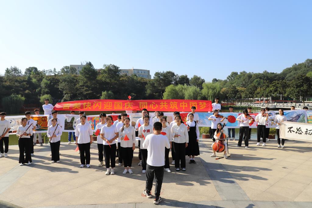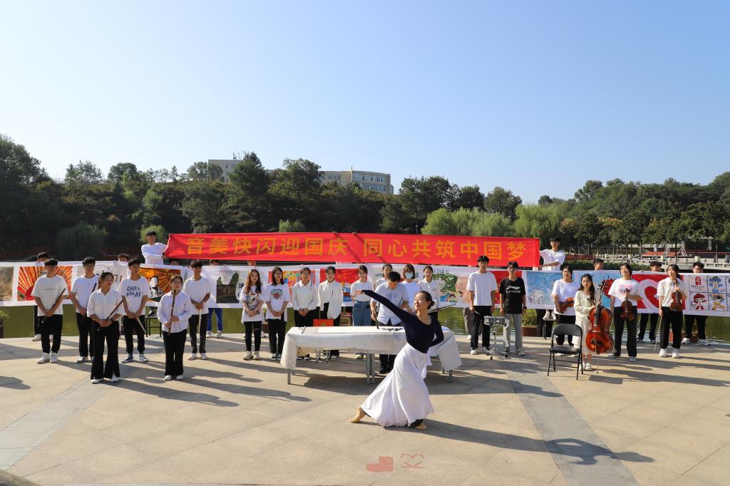 欣望江山千里秀,欢颂祖国万年春。在今天这个举国欢庆的美好日子里,由太阳集团tyc234cc和美术与设计学院联合举办迎国庆快闪活动,在图书馆前的半亩塘顺利举行,校团委领导副书记常青,太阳集团tyc234cc、美术与设计学院党委副书记,师生代表以及在场300余名同学观看了此次活动。