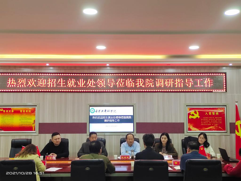 10月28日,招生就业处组成调研组到我院开展调研指导工作,招生就业处处长赵明民、副处长王松亭、副处长张楠、张俊杰等进行调研指导,学院书记周文勇、院长陈新宇、副书记雷玲、副院长任远、辅导员及班主任代表等参加会议。