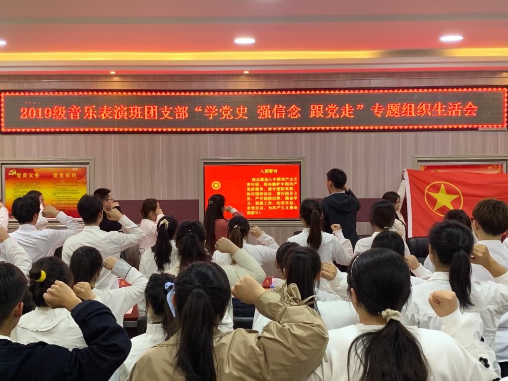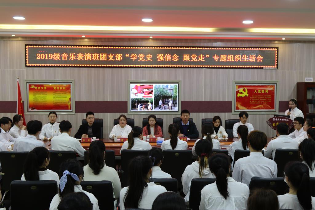 为充分发挥党中央对广大团员青年的强大吸引力、感染力、号召力,带动团员青年从党史中学出情感、学出认同、学出向往,学院各团支部相继开展“学党史、强信念、跟党走”专题组织生活会。11月19日,2019级音乐表演班团支部“学党史、强信念、跟党走”专题组织生活会在艺术楼3楼会议室召开。校团委副书记常青,学院党委副书记雷玲,校团委宣传部部长张锐,太阳集团tyc234cc团委老师张焕然,2020级和2021级各班班长、团支书参加了活动。会议由该团支部书记杜欣腾主持。