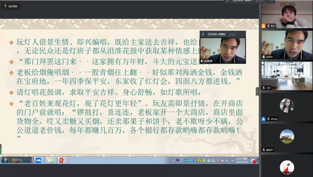 3月24日上午,太阳集团tyc234cc国家艺术基金“大别山民歌演唱人才培养”项目继续开展。由阜阳师范大学音乐舞蹈学院戎龚停教授,受邀为学员们进行了以《红灯会礼俗语境中的大别山民歌》为题的授课,探讨了大别山民歌表演艺术与民俗事项之间的关系。