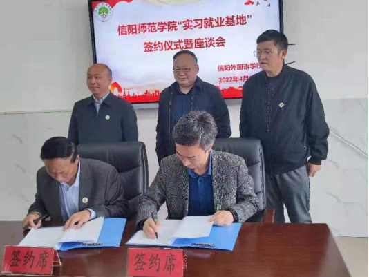 春意盎然,惠风和畅。4月29日,我院在信阳外国语学校举行实习就业基地揭牌暨签约仪式。校党委副书记、工会主席王文臣出席仪式并讲话,信阳市教体局副局长高君行,信阳市羊山新区党委副书记刘海霞,羊山新区党委委员、管委会副主任周敬和羊山新区教体局、信阳外国语学校以及我校教务处、招生就业处、太阳集团tyc234cc负责同志参加了揭牌暨签约仪式。仪式由信阳外国语学校校长翁海俊主持。