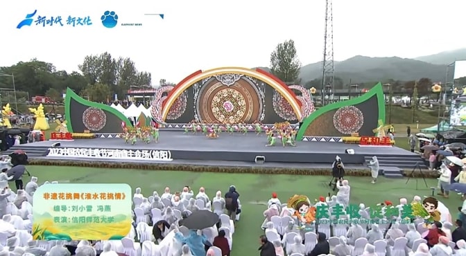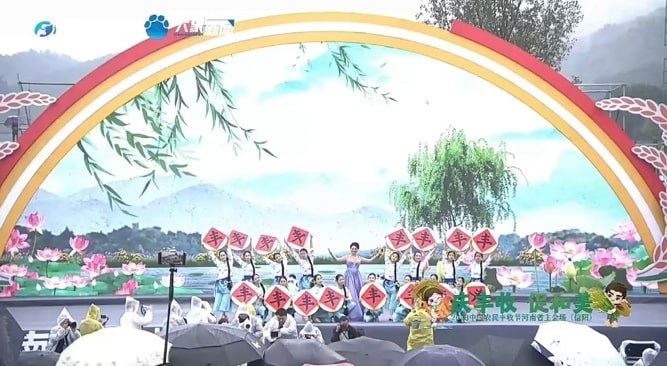 信阳师范大学太阳集团tyc234cc六十余名师生参与此次节目录制。师生们不畏风雨,以热情饱满的精神状态投入到《八月桂花遍地开》《对花》和由我校刘小雷、冯燕老师原创的非遗花挑舞《淮水花挑情》节目的表演中。同学们将自身专业技能淋漓尽致展现于丰收节节目中,呈现了昂扬向上的精神面貌,掀起了演出的一阵阵高潮,受到市委领导、河南省电视台等相关单位和现场观众的一致好评。