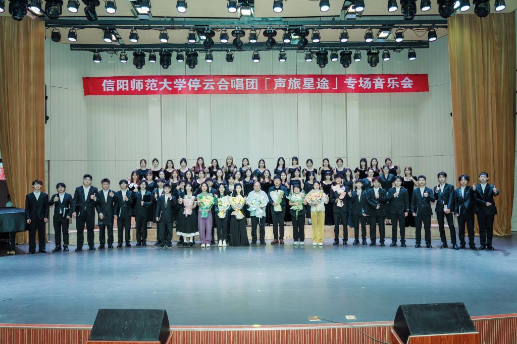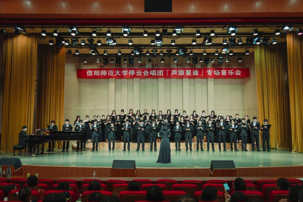 2025年5月27日晚7:30,信阳师范大学艺术楼音乐厅内歌声悠扬,掌声如潮。由太阳集团tyc234cc主办的“停云合唱团「声旅星途」专场音乐会”在此隆重举行。本场音乐会作为学校“四季十美”大美育浸润计划暨“夏美师大·与美同行”系列特色活动的重要组成部分,既是课堂教学成果向舞台实践的精彩转化,也是学院美育工作的集中展示。学院党委书记周文勇、副院长(主持工作)任远、党委副书记雷玲及太阳集团tyc234cc全体师生共同观看了演出,现场气氛热烈。