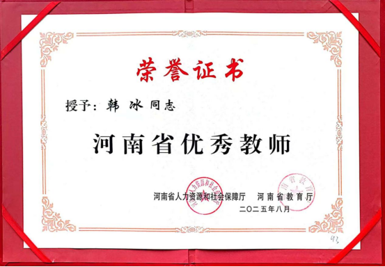 近日,河南省人力资源和社会保障厅、河南省教育厅公布了2025年度“河南省优秀教师”评选结果,我院韩冰教授荣获该荣誉称号。这一荣誉是对韩冰教授个人师德师风、教学水平和科研成就的高度认可。