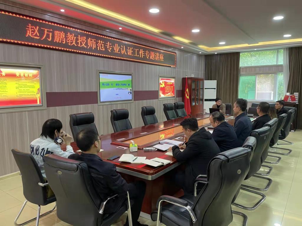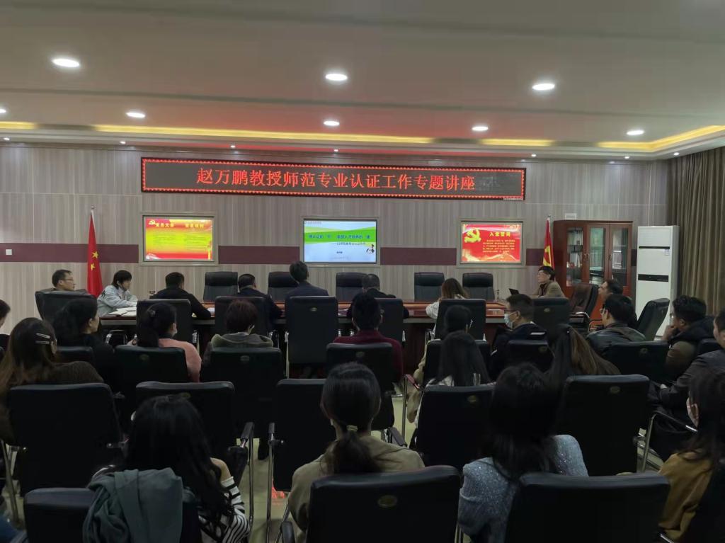 为全面深入推进我院师范类专业认证工作,11月8日下午,我院特邀请赵万鹏教授在艺术楼三楼会议室,召开师范专业认证工作专题讲座。学院党委书记周文勇、院长陈新宇、副院长任远、党委副书记雷玲和全院教师参加了会议。会议由院长陈新宇主持。